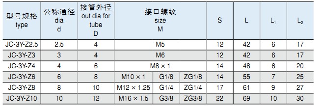 ①:插入式三通終端管接頭公稱通徑 Ø6MM JC-3T-Z6 M10×1