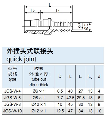 型號規(guī)格說明,下圖例JGS-W-6A(JGS-K-6B)插入式外螺紋接口。高性能快速接頭,外插式內(nèi)螺紋接口。