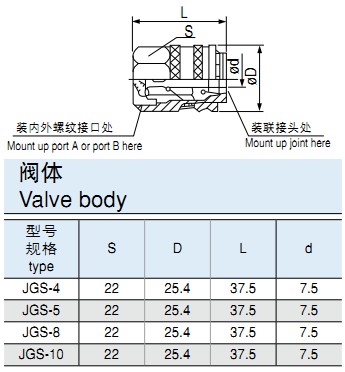 型號規(guī)格說明,下圖例JGS-W-6A(JGS-K-6B)插入式外螺紋接口。高性能快速接頭,外插式內(nèi)螺紋接口。