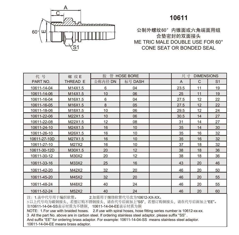 10611 公制外螺紋60°內錐面或六角端面用組合墊密封的雙面接頭