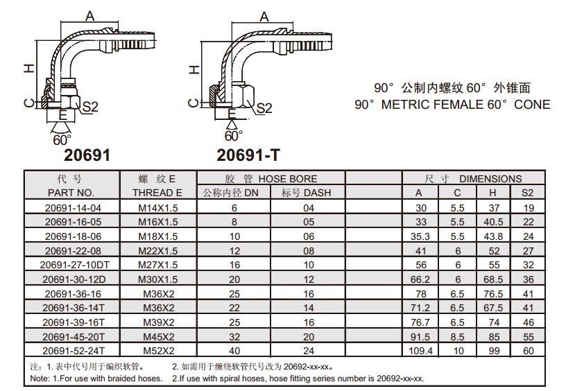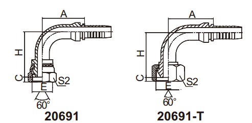 20691 90°公制內(nèi)螺紋60°外錐面 扣壓式軟管接頭