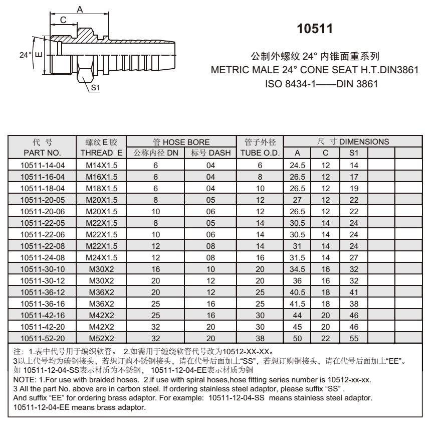 10511 公制外螺紋24°內(nèi)錐面重系列 扣壓式軟管接頭