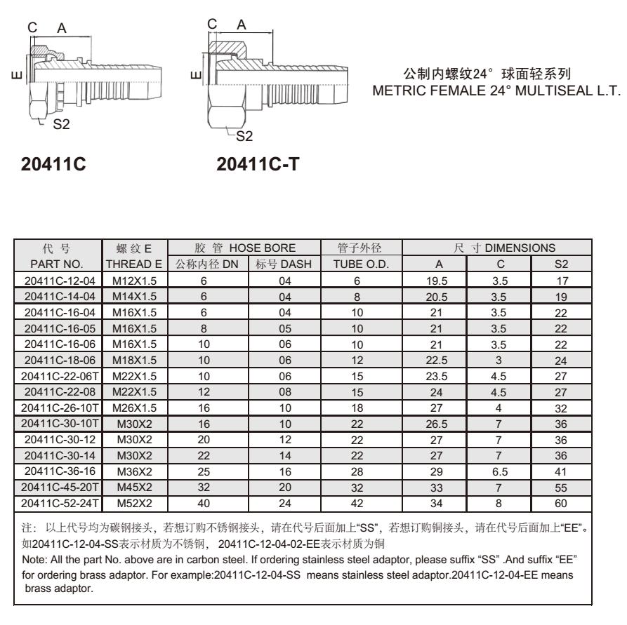 20411C 公制內(nèi)螺紋24°球面輕系列 扣壓式軟管接頭