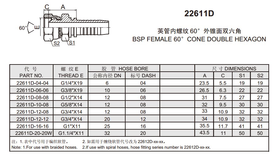 22611D 英管內(nèi)螺紋60°外錐面雙六角