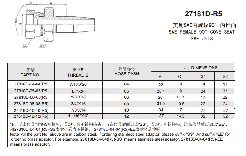 27181D-R5 美制SAE內(nèi)螺紋90°內(nèi)錐面