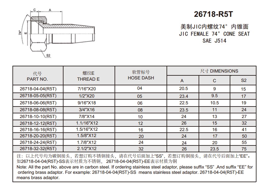 26718-R5T 美制JIC內(nèi)螺紋74°內(nèi)錐面