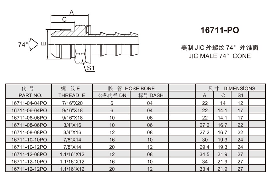 16711-PO 美制JIC外螺紋74°外錐面