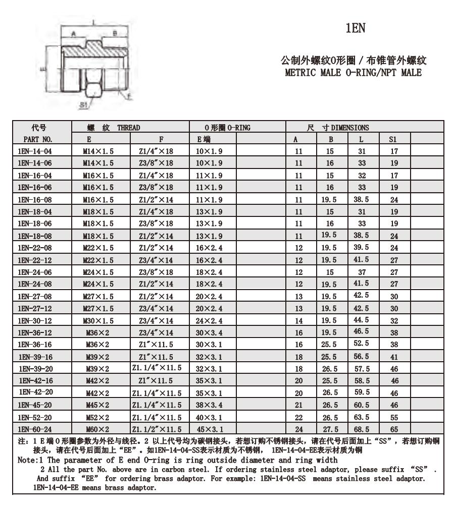 1EN 公制外螺紋O形圈/布錐管外螺紋