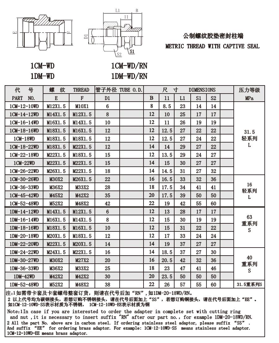 1CM-WD 1DM-WD 公制螺紋膠墊密封柱端