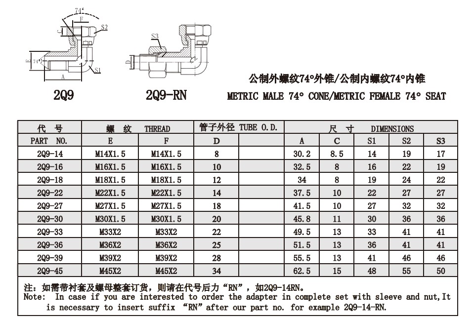 2Q9 2Q9-RN 公制外螺紋74°外錐/公制內螺紋74°內錐
