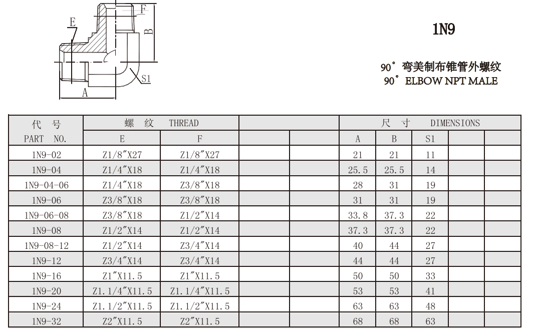 1N9 90°彎美制布錐管外螺紋
