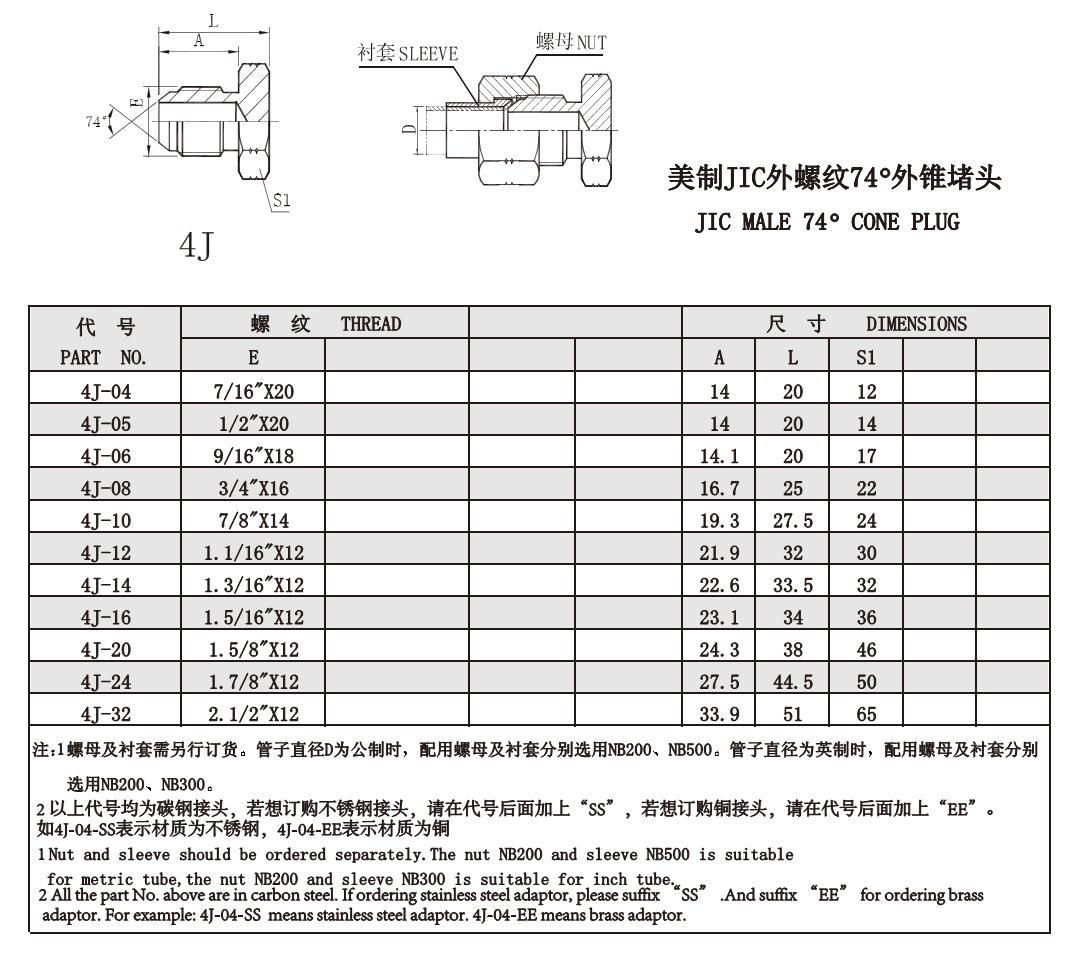 4J 美制JIC外螺紋74°外錐堵頭