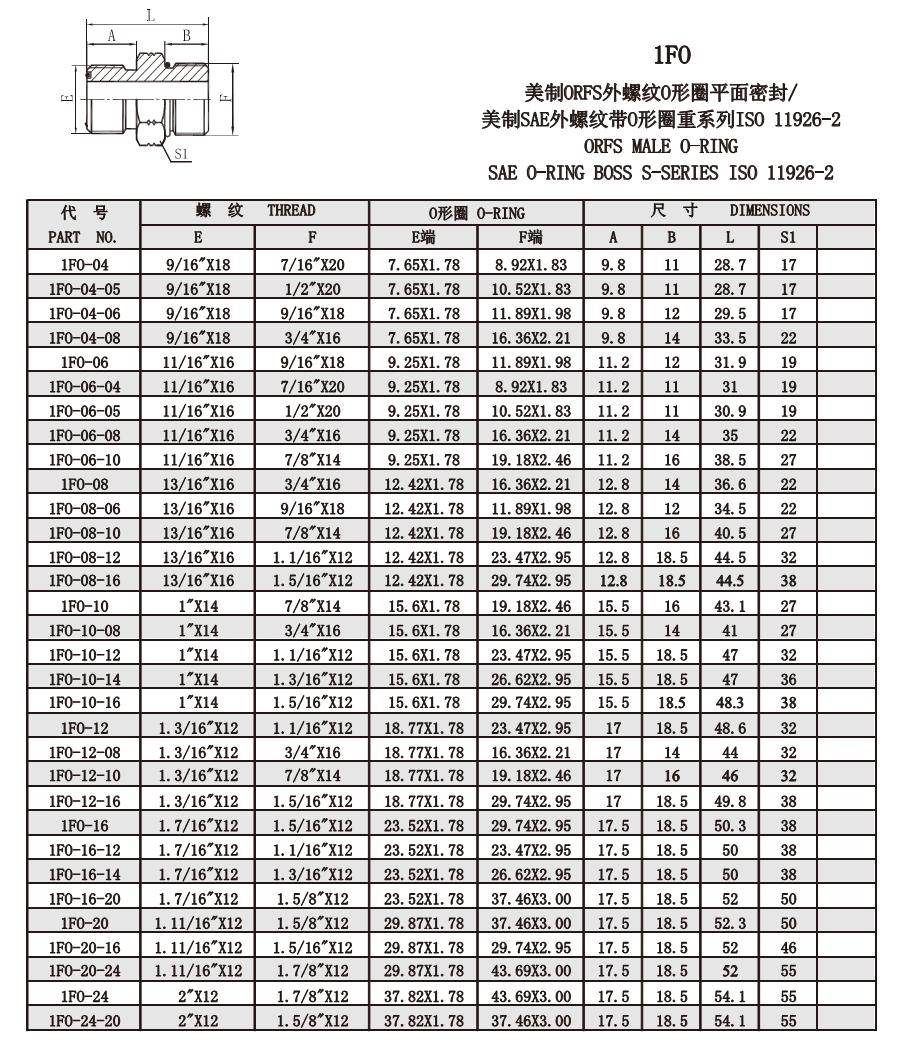 1F0 美制ORFS外螺紋O形圈平面密封/ 美制SAE外螺紋帶O形圈重系列ISO 11926-2