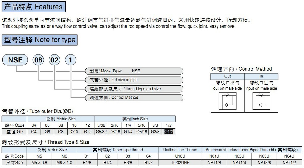 氣動(dòng)接頭 快插式 NSE系列,為單向節(jié)流閥結(jié)構(gòu),通過(guò)調(diào)節(jié)氣缸排氣流量達(dá)到氣缸調(diào)速目的,采用快速連接設(shè)計(jì),拆卸方便。