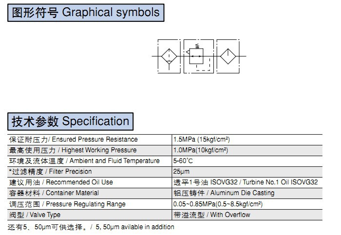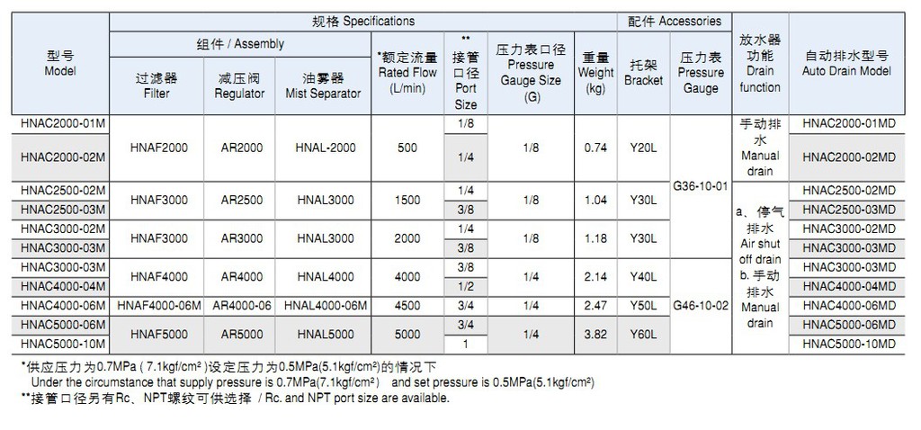 華通氣動牌 氣源處理器 空氣過濾組合 三聯(lián)件 HNAC系列 技術(shù)參數(shù) Speci?cation保證耐壓力/ Ensured Pressure Resistance 1.5MPa (15kgf/cm2)最高使用壓力 / Hi