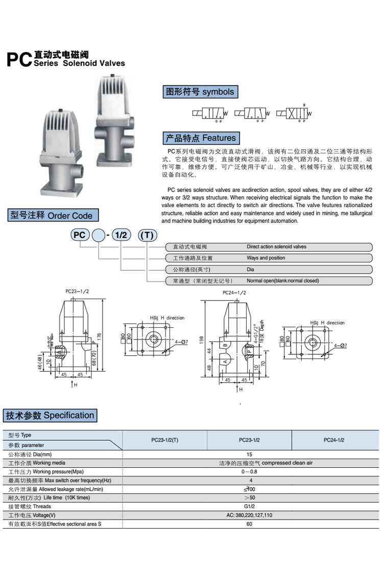 直動式 電磁閥 PC系列 兩位三通產(chǎn)品特點 PC系列電磁閥為交流直動式滑閥,該閥有二位四通及二位三通等結(jié)構形式。它接受電信號,直接使閥芯運動,以切換氣路方向。它結(jié)構合理,動作可靠,維修方便??蓮V泛使用于礦山、冶金、機械等行業(yè),以實現(xiàn)機械設