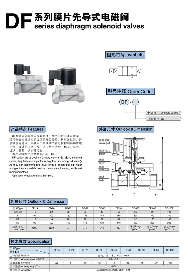DF系列 膜片先導(dǎo)式電磁閥 產(chǎn)品特點(diǎn) DF系列電磁閥是電控管路通、斷的二位二通電磁閥,采用電磁先導(dǎo)結(jié)構(gòu)的優(yōu)質(zhì)的橡膠膜片,具有彈性好,開(kāi)啟輕便的特點(diǎn),主要用于自動(dòng)調(diào)節(jié)及遠(yuǎn)程控制各種管道中氣、液體的流通。被廣泛應(yīng)用于冶