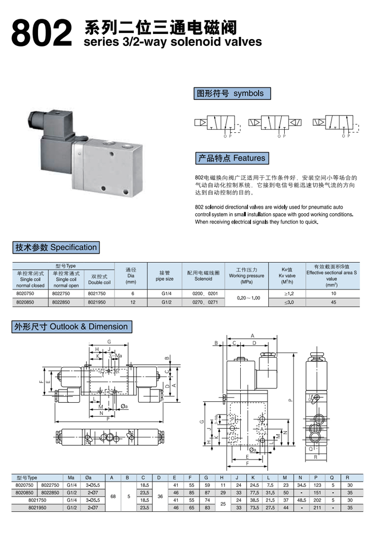 802 solenoid directional valves are widely used for pneumatic auto controlsystem in small instullation space with good working conditions. When receiving electrical signals they function to quick.