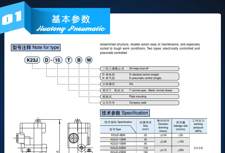 華通氣動 板接 截止式 換向電磁閥 K23J-BW系列 兩位三通,可提供定制