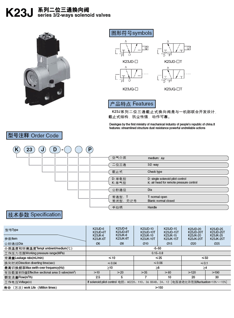 K23J系列 二位三通截止式換向閥 產(chǎn)品特點(diǎn): K23J系列二位三通截止式換向閥是一機(jī)部換向閥聯(lián)合設(shè)計(jì),具有結(jié)構(gòu)合理動(dòng)作可靠特點(diǎn)。