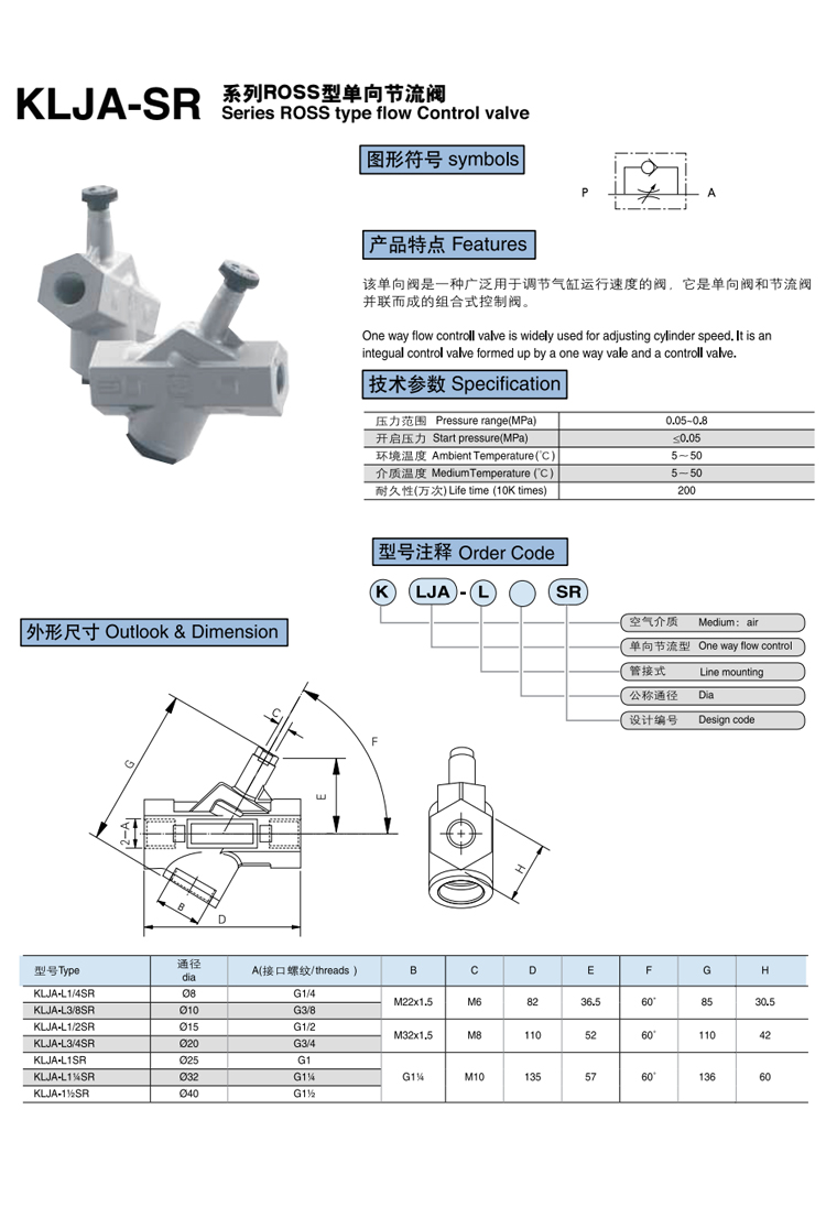 華通氣動 ROSS型單向節(jié)流閥 KLJA-SR系列,可提供定制